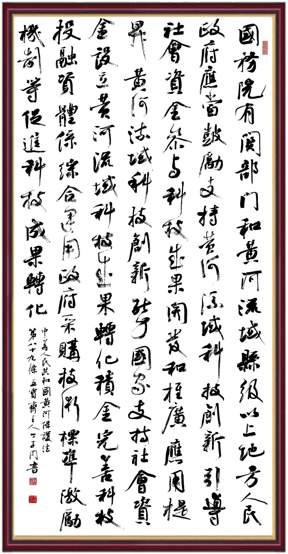 黃河寧,天下平。黃河是中華民族的發(fā)源地和搖籃,保護(hù)黃河是事關(guān)中華民族偉大復(fù)興的千秋大計(jì)?!吨腥A人民共和國黃河保護(hù)法》為推進(jìn)水資源節(jié)約集約利用、保護(hù)傳承弘揚(yáng)黃河文化、推動(dòng)黃河流域生態(tài)保護(hù)和高質(zhì)量發(fā)展提供了有力法治保障。繼書寫《中華人民共和國民法典》《中華人民共和國憲法》《中華人民共和國澳門特別行政區(qū)基本法》《中華人民共和國香港特別行政區(qū)基本法》《中華人民共和國國旗法》《中華人民共和國國徽法》《中華人民共和國國歌法》《中華人民共和國法官法》等法律法規(guī)之后,法制日報(bào)社聯(lián)合沿黃九省(區(qū))司法廳、書法家協(xié)會(huì),將筆端對準(zhǔn)《中華人民共和國黃河保護(hù)法》。