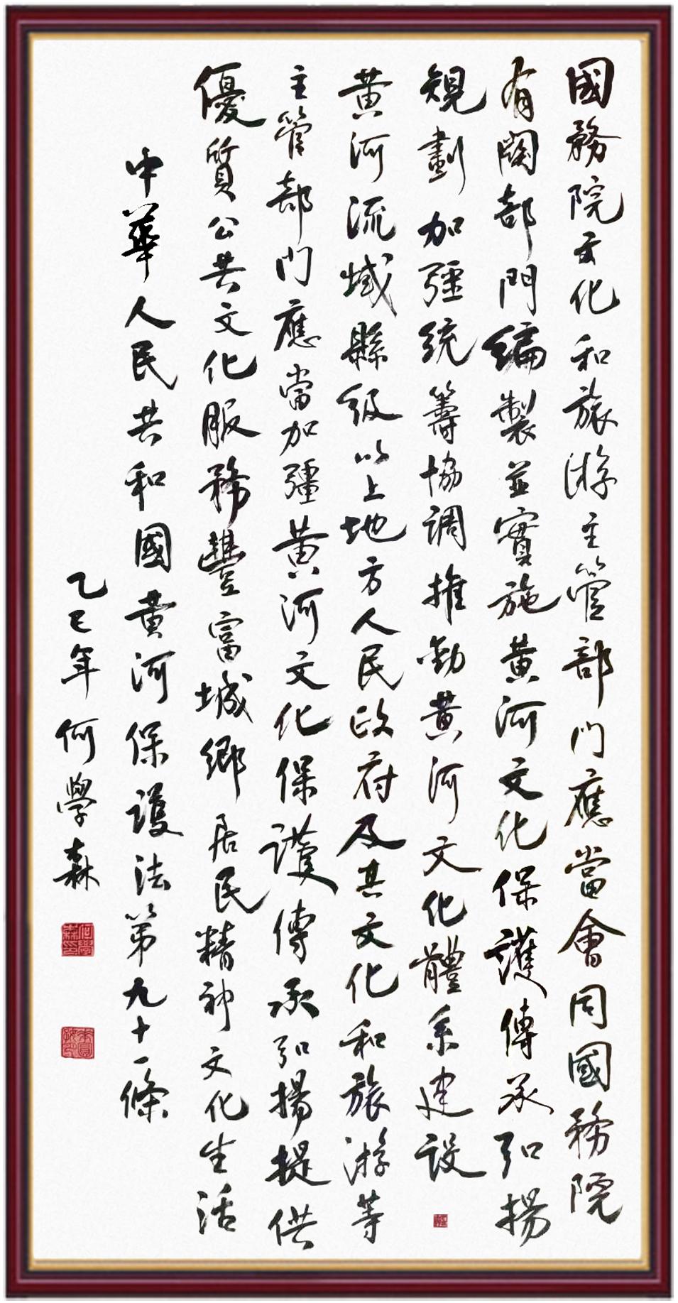 黃河寧,天下平。黃河是中華民族的發(fā)源地和搖籃,保護黃河是事關(guān)中華民族偉大復(fù)興的千秋大計。《中華人民共和國黃河保護法》為推進水資源節(jié)約集約利用、保護傳承弘揚黃河文化、推動黃河流域生態(tài)保護和高質(zhì)量發(fā)展提供了有力法治保障。繼書寫《中華人民共和國民法典》《中華人民共和國憲法》《中華人民共和國澳門特別行政區(qū)基本法》《中華人民共和國香港特別行政區(qū)基本法》《中華人民共和國國旗法》《中華人民共和國國徽法》《中華人民共和國國歌法》《中華人民共和國法官法》等法律法規(guī)之后,法制日報社聯(lián)合沿黃九省(區(qū))司法廳、書法家協(xié)會,將筆端對準《中華人民共和國黃河保護法》。
