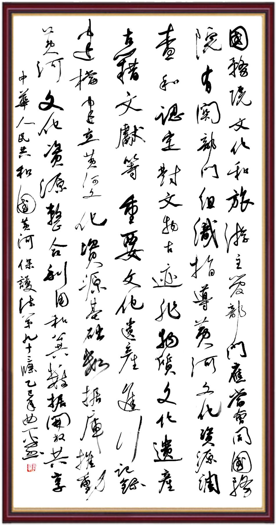 黃河寧,天下平。黃河是中華民族的發(fā)源地和搖籃,保護(hù)黃河是事關(guān)中華民族偉大復(fù)興的千秋大計(jì)。《中華人民共和國(guó)黃河保護(hù)法》為推進(jìn)水資源節(jié)約集約利用、保護(hù)傳承弘揚(yáng)黃河文化、推動(dòng)黃河流域生態(tài)保護(hù)和高質(zhì)量發(fā)展提供了有力法治保障。繼書(shū)寫(xiě)《中華人民共和國(guó)民法典》《中華人民共和國(guó)憲法》《中華人民共和國(guó)澳門(mén)特別行政區(qū)基本法》《中華人民共和國(guó)香港特別行政區(qū)基本法》《中華人民共和國(guó)國(guó)旗法》《中華人民共和國(guó)國(guó)徽法》《中華人民共和國(guó)國(guó)歌法》《中華人民共和國(guó)法官法》等法律法規(guī)之后,法制日?qǐng)?bào)社聯(lián)合沿黃九?。▍^(qū))司法廳、書(shū)法家協(xié)會(huì),將筆端對(duì)準(zhǔn)《中華人民共和國(guó)黃河保護(hù)法》。