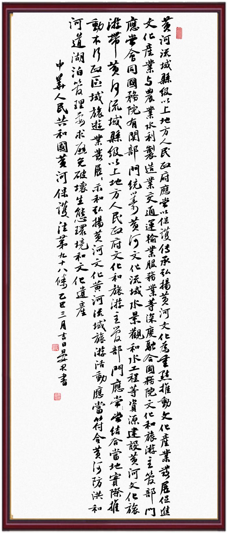 黃河寧,天下平。黃河是中華民族的發(fā)源地和搖籃,保護黃河是事關(guān)中華民族偉大復興的千秋大計?!吨腥A人民共和國黃河保護法》為推進水資源節(jié)約集約利用、保護傳承弘揚黃河文化、推動黃河流域生態(tài)保護和高質(zhì)量發(fā)展提供了有力法治保障。繼書寫《中華人民共和國民法典》《中華人民共和國憲法》《中華人民共和國澳門特別行政區(qū)基本法》《中華人民共和國香港特別行政區(qū)基本法》《中華人民共和國國旗法》《中華人民共和國國徽法》《中華人民共和國國歌法》《中華人民共和國法官法》等法律法規(guī)之后,法制日報社聯(lián)合沿黃九?。▍^(qū))司法廳、書法家協(xié)會,將筆端對準《中華人民共和國黃河保護法》。