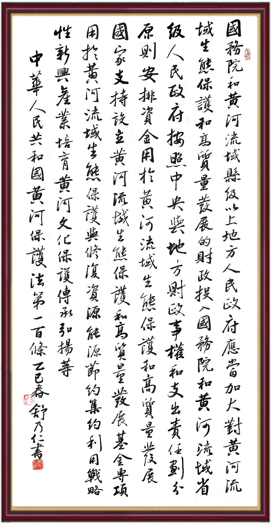 黃河寧,天下平。黃河是中華民族的發(fā)源地和搖籃,保護(hù)黃河是事關(guān)中華民族偉大復(fù)興的千秋大計(jì)?!吨腥A人民共和國黃河保護(hù)法》為推進(jìn)水資源節(jié)約集約利用、保護(hù)傳承弘揚(yáng)黃河文化、推動(dòng)黃河流域生態(tài)保護(hù)和高質(zhì)量發(fā)展提供了有力法治保障。繼書寫《中華人民共和國民法典》《中華人民共和國憲法》《中華人民共和國澳門特別行政區(qū)基本法》《中華人民共和國香港特別行政區(qū)基本法》《中華人民共和國國旗法》《中華人民共和國國徽法》《中華人民共和國國歌法》《中華人民共和國法官法》等法律法規(guī)之后,法制日報(bào)社聯(lián)合沿黃九?。▍^(qū))司法廳、書法家協(xié)會(huì),將筆端對準(zhǔn)《中華人民共和國黃河保護(hù)法》。