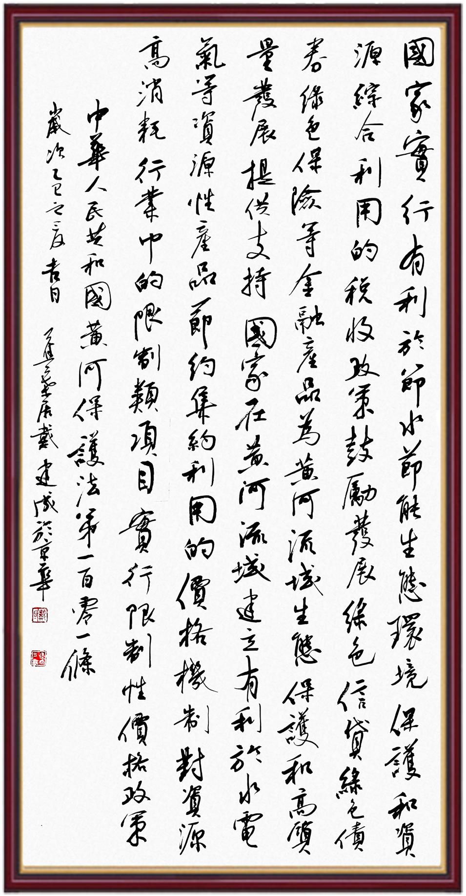 黃河寧,天下平。黃河是中華民族的發(fā)源地和搖籃,保護黃河是事關(guān)中華民族偉大復(fù)興的千秋大計?!吨腥A人民共和國黃河保護法》為推進水資源節(jié)約集約利用、保護傳承弘揚黃河文化、推動黃河流域生態(tài)保護和高質(zhì)量發(fā)展提供了有力法治保障。繼書寫《中華人民共和國民法典》《中華人民共和國憲法》《中華人民共和國澳門特別行政區(qū)基本法》《中華人民共和國香港特別行政區(qū)基本法》《中華人民共和國國旗法》《中華人民共和國國徽法》《中華人民共和國國歌法》《中華人民共和國法官法》等法律法規(guī)之后,法制日報社聯(lián)合沿黃九?。▍^(qū))司法廳、書法家協(xié)會,將筆端對準《中華人民共和國黃河保護法》。
