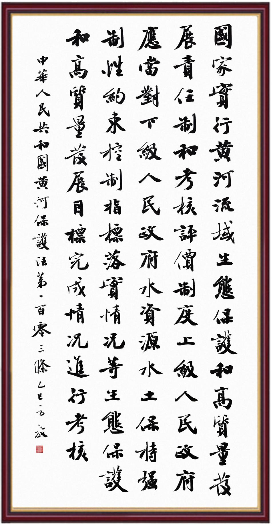 黃河寧,天下平。黃河是中華民族的發(fā)源地和搖籃,保護(hù)黃河是事關(guān)中華民族偉大復(fù)興的千秋大計?!吨腥A人民共和國黃河保護(hù)法》為推進(jìn)水資源節(jié)約集約利用、保護(hù)傳承弘揚(yáng)黃河文化、推動黃河流域生態(tài)保護(hù)和高質(zhì)量發(fā)展提供了有力法治保障。繼書寫《中華人民共和國民法典》《中華人民共和國憲法》《中華人民共和國澳門特別行政區(qū)基本法》《中華人民共和國香港特別行政區(qū)基本法》《中華人民共和國國旗法》《中華人民共和國國徽法》《中華人民共和國國歌法》《中華人民共和國法官法》等法律法規(guī)之后,法制日報社聯(lián)合沿黃九省(區(qū))司法廳、書法家協(xié)會,將筆端對準(zhǔn)《中華人民共和國黃河保護(hù)法》。