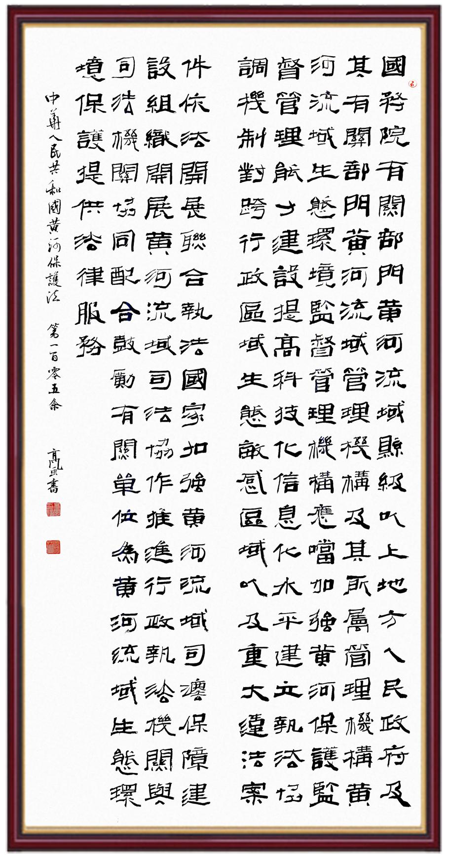 黃河寧,天下平。黃河是中華民族的發(fā)源地和搖籃,保護(hù)黃河是事關(guān)中華民族偉大復(fù)興的千秋大計(jì)?!吨腥A人民共和國黃河保護(hù)法》為推進(jìn)水資源節(jié)約集約利用、保護(hù)傳承弘揚(yáng)黃河文化、推動(dòng)黃河流域生態(tài)保護(hù)和高質(zhì)量發(fā)展提供了有力法治保障。繼書寫《中華人民共和國民法典》《中華人民共和國憲法》《中華人民共和國澳門特別行政區(qū)基本法》《中華人民共和國香港特別行政區(qū)基本法》《中華人民共和國國旗法》《中華人民共和國國徽法》《中華人民共和國國歌法》《中華人民共和國法官法》等法律法規(guī)之后,法制日報(bào)社聯(lián)合沿黃九?。▍^(qū))司法廳、書法家協(xié)會(huì),將筆端對準(zhǔn)《中華人民共和國黃河保護(hù)法》。