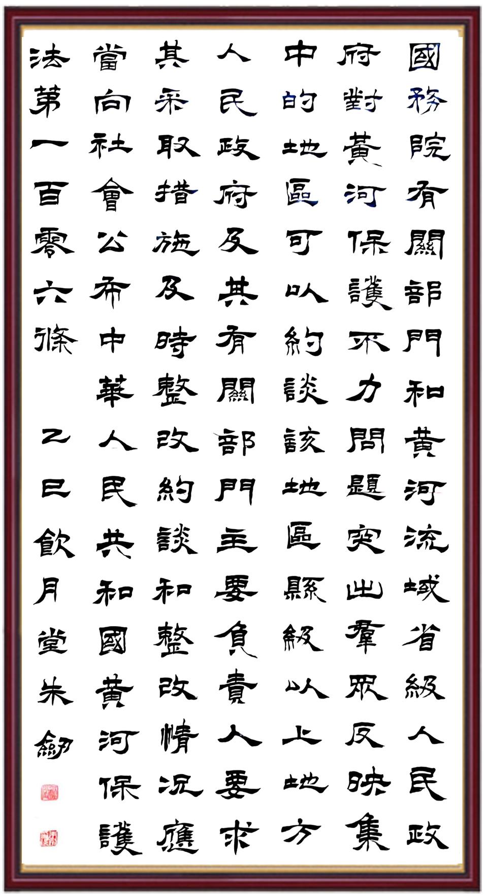 黃河寧,天下平。黃河是中華民族的發(fā)源地和搖籃,保護(hù)黃河是事關(guān)中華民族偉大復(fù)興的千秋大計(jì)?!吨腥A人民共和國黃河保護(hù)法》為推進(jìn)水資源節(jié)約集約利用、保護(hù)傳承弘揚(yáng)黃河文化、推動(dòng)黃河流域生態(tài)保護(hù)和高質(zhì)量發(fā)展提供了有力法治保障。繼書寫《中華人民共和國民法典》《中華人民共和國憲法》《中華人民共和國澳門特別行政區(qū)基本法》《中華人民共和國香港特別行政區(qū)基本法》《中華人民共和國國旗法》《中華人民共和國國徽法》《中華人民共和國國歌法》《中華人民共和國法官法》等法律法規(guī)之后,法制日?qǐng)?bào)社聯(lián)合沿黃九省(區(qū))司法廳、書法家協(xié)會(huì),將筆端對(duì)準(zhǔn)《中華人民共和國黃河保護(hù)法》。