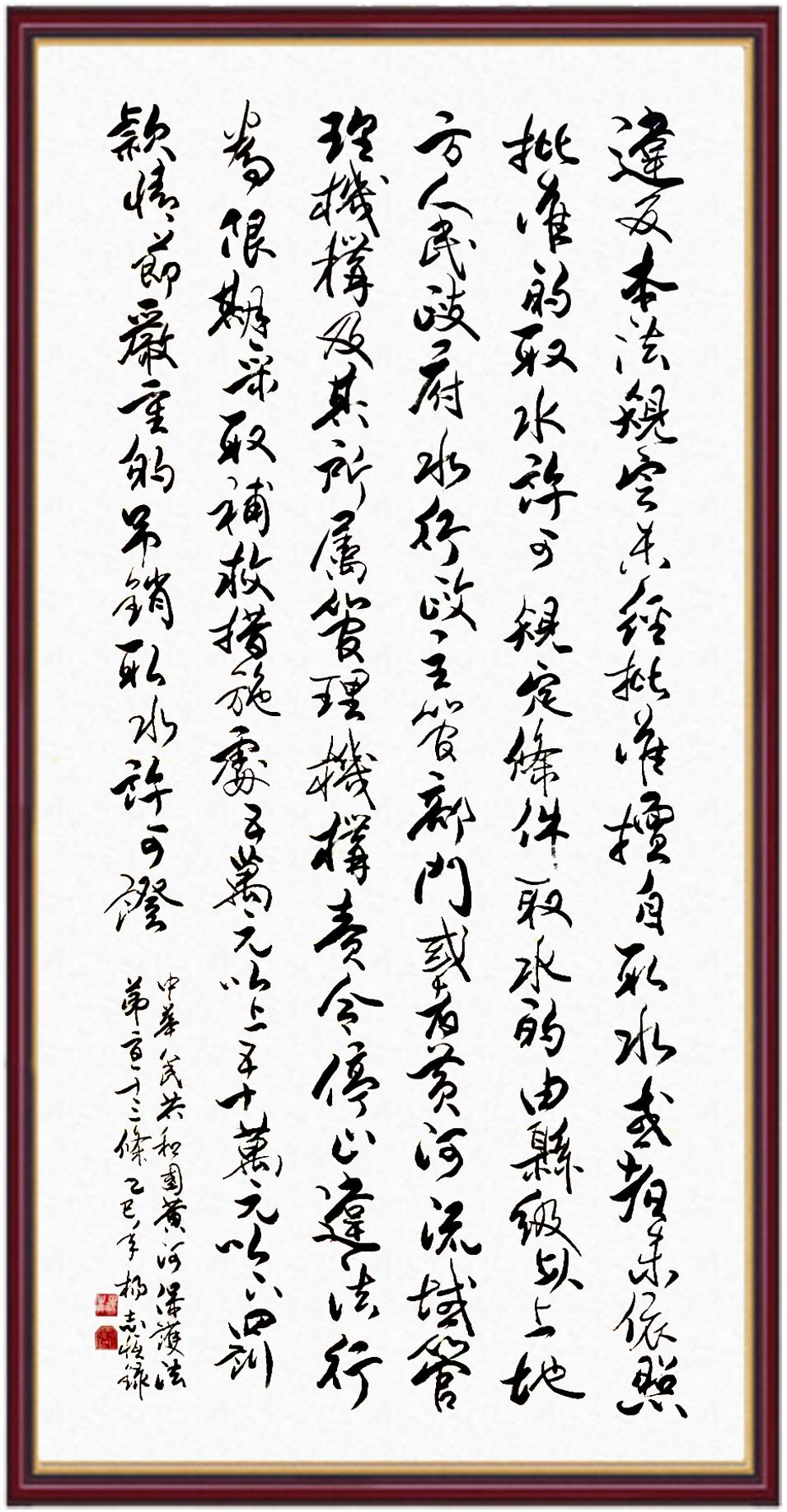 黃河寧,天下平。黃河是中華民族的發(fā)源地和搖籃,保護(hù)黃河是事關(guān)中華民族偉大復(fù)興的千秋大計?!吨腥A人民共和國黃河保護(hù)法》為推進(jìn)水資源節(jié)約集約利用、保護(hù)傳承弘揚黃河文化、推動黃河流域生態(tài)保護(hù)和高質(zhì)量發(fā)展提供了有力法治保障。繼書寫《中華人民共和國民法典》《中華人民共和國憲法》《中華人民共和國澳門特別行政區(qū)基本法》《中華人民共和國香港特別行政區(qū)基本法》《中華人民共和國國旗法》《中華人民共和國國徽法》《中華人民共和國國歌法》《中華人民共和國法官法》等法律法規(guī)之后,法制日報社聯(lián)合沿黃九?。▍^(qū))司法廳、書法家協(xié)會,將筆端對準(zhǔn)《中華人民共和國黃河保護(hù)法》。