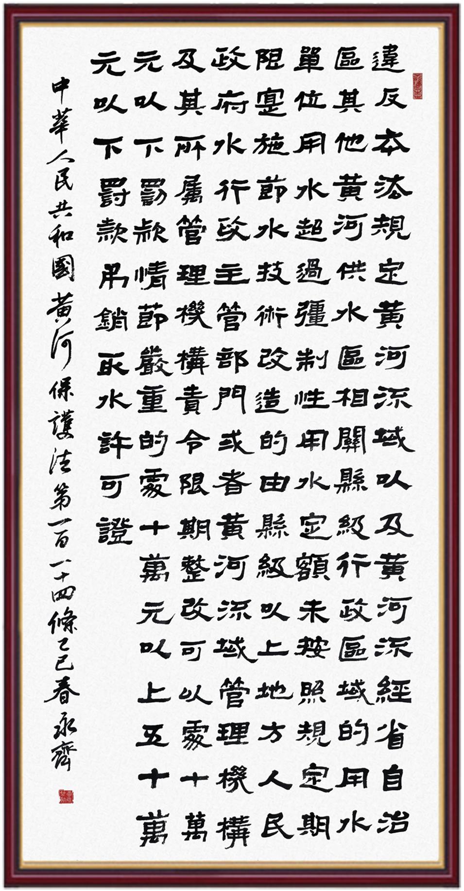 黃河寧,天下平。黃河是中華民族的發(fā)源地和搖籃,保護(hù)黃河是事關(guān)中華民族偉大復(fù)興的千秋大計。《中華人民共和國黃河保護(hù)法》為推進(jìn)水資源節(jié)約集約利用、保護(hù)傳承弘揚黃河文化、推動黃河流域生態(tài)保護(hù)和高質(zhì)量發(fā)展提供了有力法治保障。繼書寫《中華人民共和國民法典》《中華人民共和國憲法》《中華人民共和國澳門特別行政區(qū)基本法》《中華人民共和國香港特別行政區(qū)基本法》《中華人民共和國國旗法》《中華人民共和國國徽法》《中華人民共和國國歌法》《中華人民共和國法官法》等法律法規(guī)之后,法制日報社聯(lián)合沿黃九?。▍^(qū))司法廳、書法家協(xié)會,將筆端對準(zhǔn)《中華人民共和國黃河保護(hù)法》。