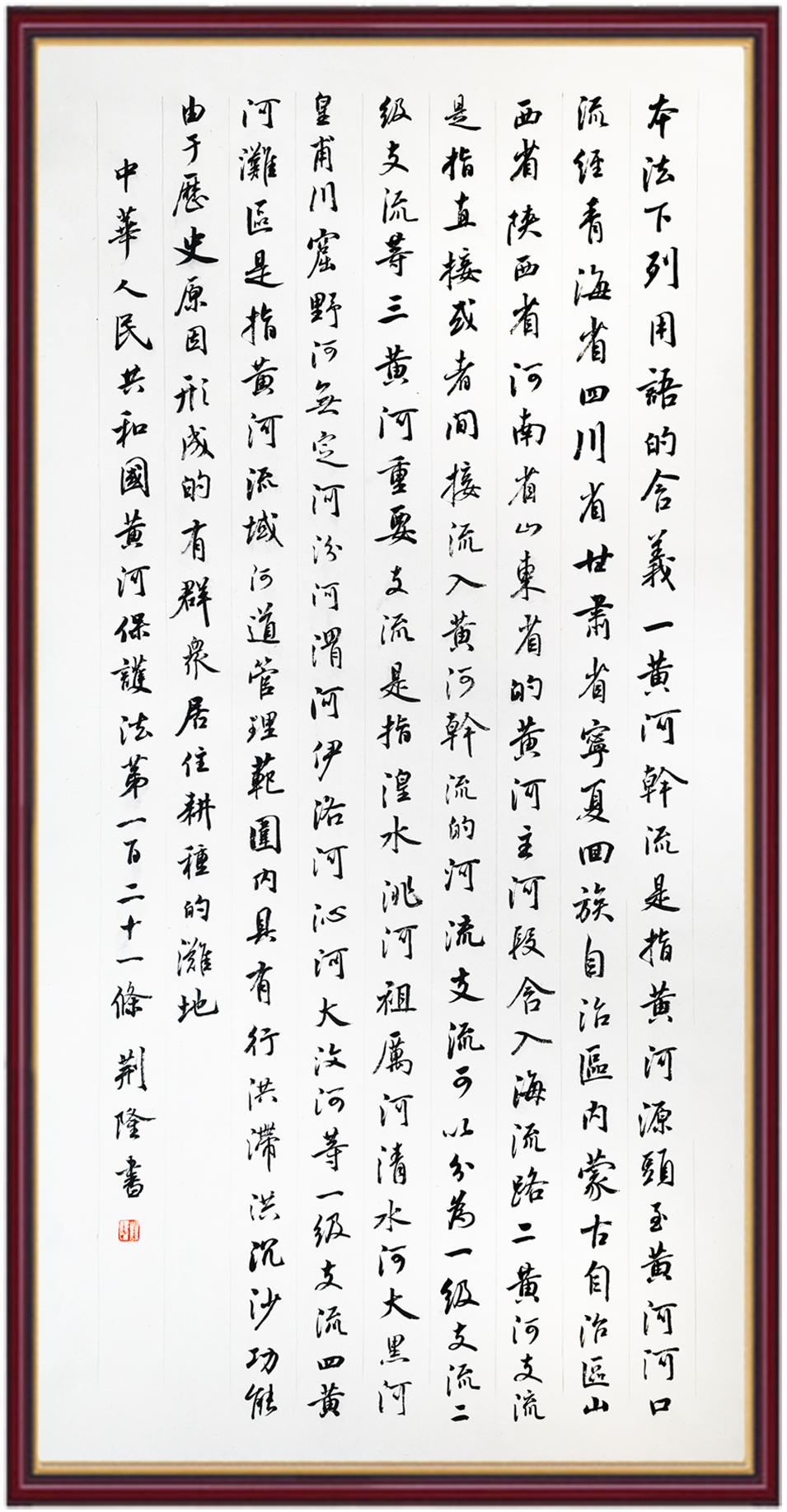 黃河寧,天下平。黃河是中華民族的發(fā)源地和搖籃,保護黃河是事關中華民族偉大復興的千秋大計?!吨腥A人民共和國黃河保護法》為推進水資源節(jié)約集約利用、保護傳承弘揚黃河文化、推動黃河流域生態(tài)保護和高質(zhì)量發(fā)展提供了有力法治保障。繼書寫《中華人民共和國民法典》《中華人民共和國憲法》《中華人民共和國澳門特別行政區(qū)基本法》《中華人民共和國香港特別行政區(qū)基本法》《中華人民共和國國旗法》《中華人民共和國國徽法》《中華人民共和國國歌法》《中華人民共和國法官法》等法律法規(guī)之后,法制日報社聯(lián)合沿黃九?。▍^(qū))司法廳、書法家協(xié)會,將筆端對準《中華人民共和國黃河保護法》。