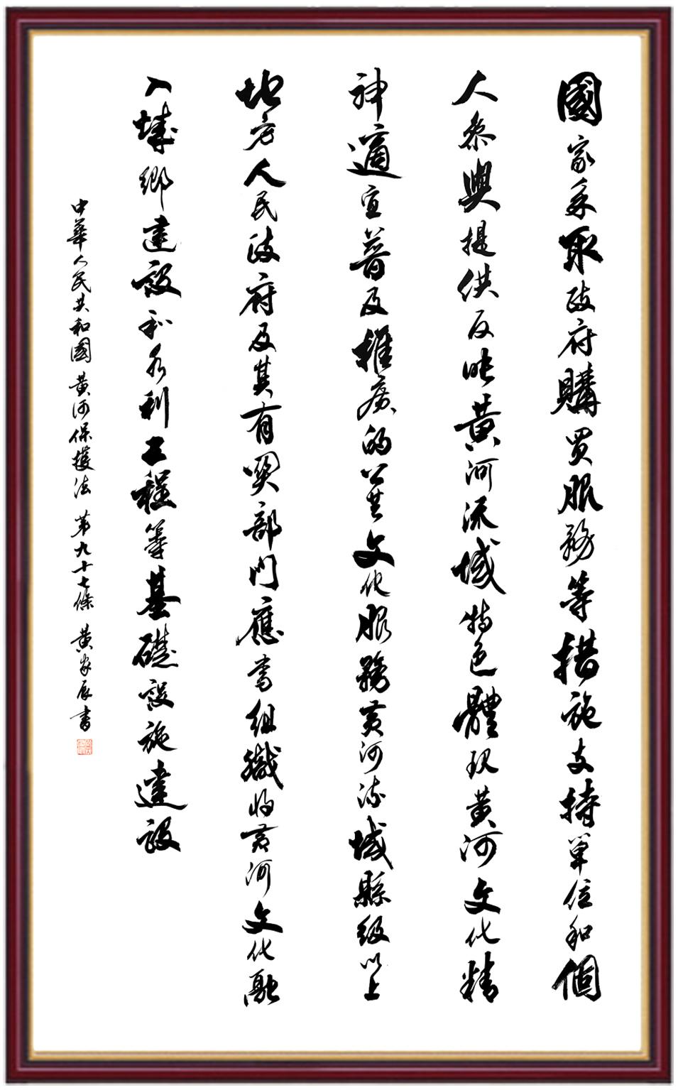 黃河寧,天下平。黃河是中華民族的發(fā)源地和搖籃,保護黃河是事關(guān)中華民族偉大復(fù)興的千秋大計?!吨腥A人民共和國黃河保護法》為推進水資源節(jié)約集約利用、保護傳承弘揚黃河文化、推動黃河流域生態(tài)保護和高質(zhì)量發(fā)展提供了有力法治保障。繼書寫《中華人民共和國民法典》《中華人民共和國憲法》《中華人民共和國澳門特別行政區(qū)基本法》《中華人民共和國香港特別行政區(qū)基本法》《中華人民共和國國旗法》《中華人民共和國國徽法》《中華人民共和國國歌法》《中華人民共和國法官法》等法律法規(guī)之后,法制日報社聯(lián)合沿黃九?。▍^(qū))司法廳、書法家協(xié)會,將筆端對準《中華人民共和國黃河保護法》。