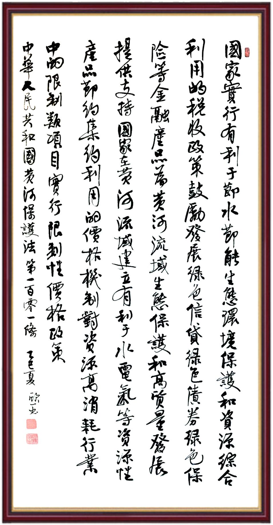 黃河寧,天下平。黃河是中華民族的發(fā)源地和搖籃,保護黃河是事關中華民族偉大復興的千秋大計。《中華人民共和國黃河保護法》為推進水資源節(jié)約集約利用、保護傳承弘揚黃河文化、推動黃河流域生態(tài)保護和高質(zhì)量發(fā)展提供了有力法治保障。繼書寫《中華人民共和國民法典》《中華人民共和國憲法》《中華人民共和國澳門特別行政區(qū)基本法》《中華人民共和國香港特別行政區(qū)基本法》《中華人民共和國國旗法》《中華人民共和國國徽法》《中華人民共和國國歌法》《中華人民共和國法官法》等法律法規(guī)之后,法制日報社聯(lián)合沿黃九?。▍^(qū))司法廳、書法家協(xié)會,將筆端對準《中華人民共和國黃河保護法》。