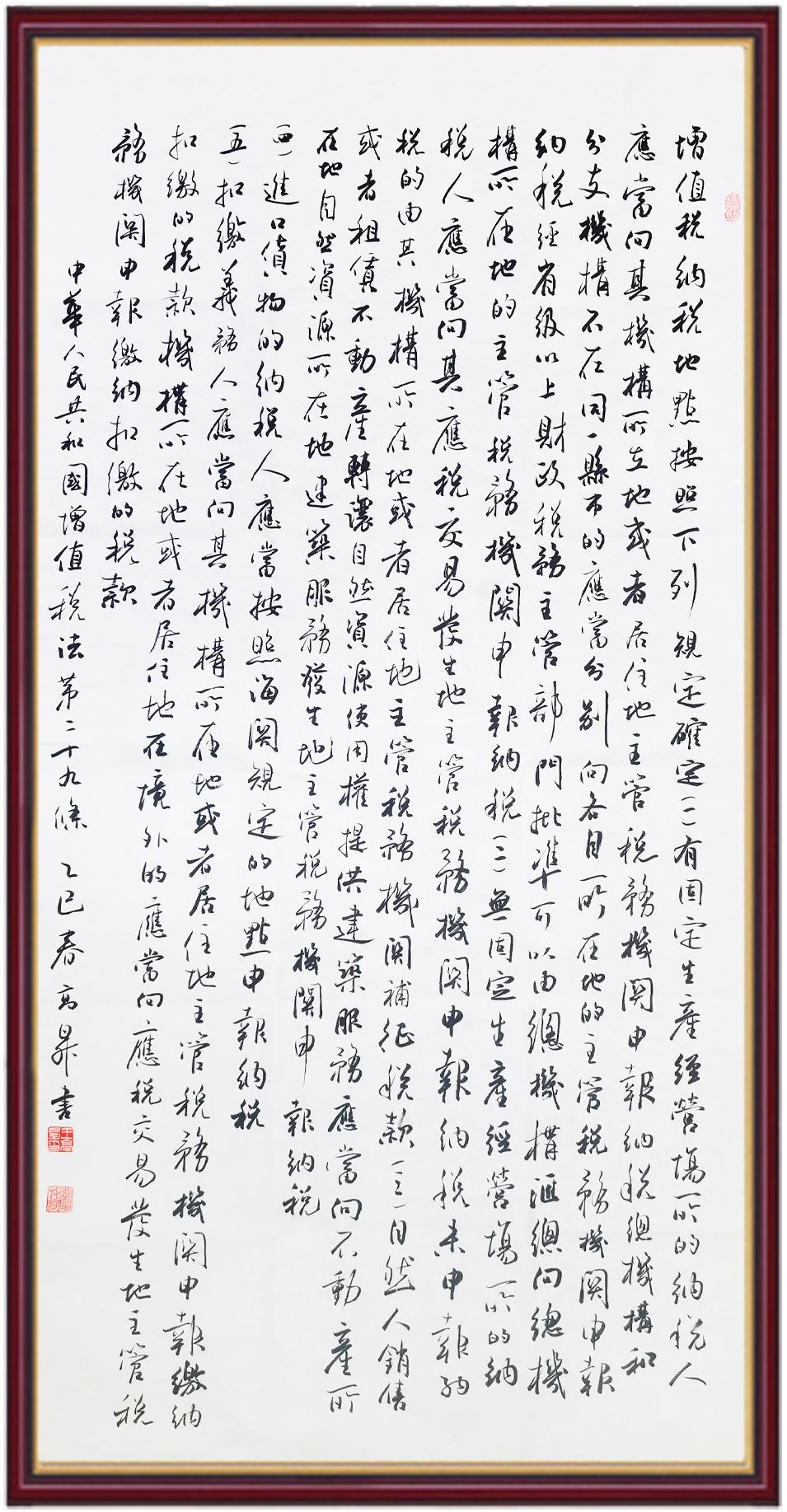稅收一頭連著國(guó)計(jì),一頭連著民生。全面推進(jìn)依法治稅,是全面依法治國(guó)基本方略在稅收領(lǐng)域的集中體現(xiàn)?!吨腥A人民共和國(guó)增值稅法》將于2026年1月1日起施行,對(duì)全面落實(shí)稅收法定原則、健全有利于高質(zhì)量發(fā)展的增值稅制度、規(guī)范增值稅的征收和繳納、保護(hù)納稅人合法權(quán)益具有重要意義。繼書(shū)寫《中華人民共和國(guó)民法典》《中華人民共和國(guó)憲法》《中華人民共和國(guó)國(guó)旗法》《中華人民共和國(guó)國(guó)徽法》《中華人民共和國(guó)國(guó)歌法》《中華人民共和國(guó)法官法》《中華人民共和國(guó)黃河保護(hù)法》等法律法規(guī)之后,法制日?qǐng)?bào)社將筆端對(duì)準(zhǔn)《中華人民共和國(guó)增值稅法》。