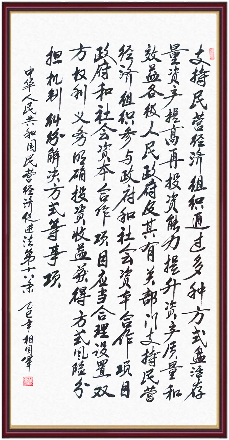 《中華人民共和國民營經(jīng)濟(jì)促進(jìn)法》自今年5月20日起施行。作為我國首部專門關(guān)于民營經(jīng)濟(jì)發(fā)展的基礎(chǔ)性法律,民營經(jīng)濟(jì)促進(jìn)法將支持和保障民營經(jīng)濟(jì)發(fā)展的法律制度融入中國特色社會主義法律體系,具有重大的法治意義,為促進(jìn)民營經(jīng)濟(jì)持續(xù)、健康、高質(zhì)量發(fā)展提供了堅(jiān)實(shí)的法治保障。為更好地學(xué)習(xí)、宣傳、貫徹這部法律,法治日報(bào)社聯(lián)合司法部普法與依法治理局,開展“‘書·法’系列活動之書寫《中華人民共和國民營經(jīng)濟(jì)促進(jìn)法》”活動。