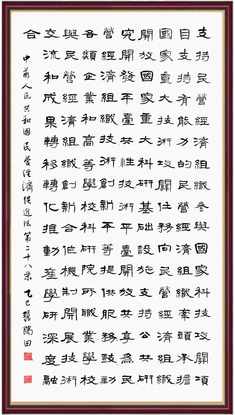 《中華人民共和國民營經(jīng)濟促進法》自今年5月20日起施行。作為我國首部專門關(guān)于民營經(jīng)濟發(fā)展的基礎(chǔ)性法律,民營經(jīng)濟促進法將支持和保障民營經(jīng)濟發(fā)展的法律制度融入中國特色社會主義法律體系,具有重大的法治意義,為促進民營經(jīng)濟持續(xù)、健康、高質(zhì)量發(fā)展提供了堅實的法治保障。為更好地學(xué)習、宣傳、貫徹這部法律,法治日報社聯(lián)合司法部普法與依法治理局,開展“‘書·法’系列活動之書寫《中華人民共和國民營經(jīng)濟促進法》”活動。