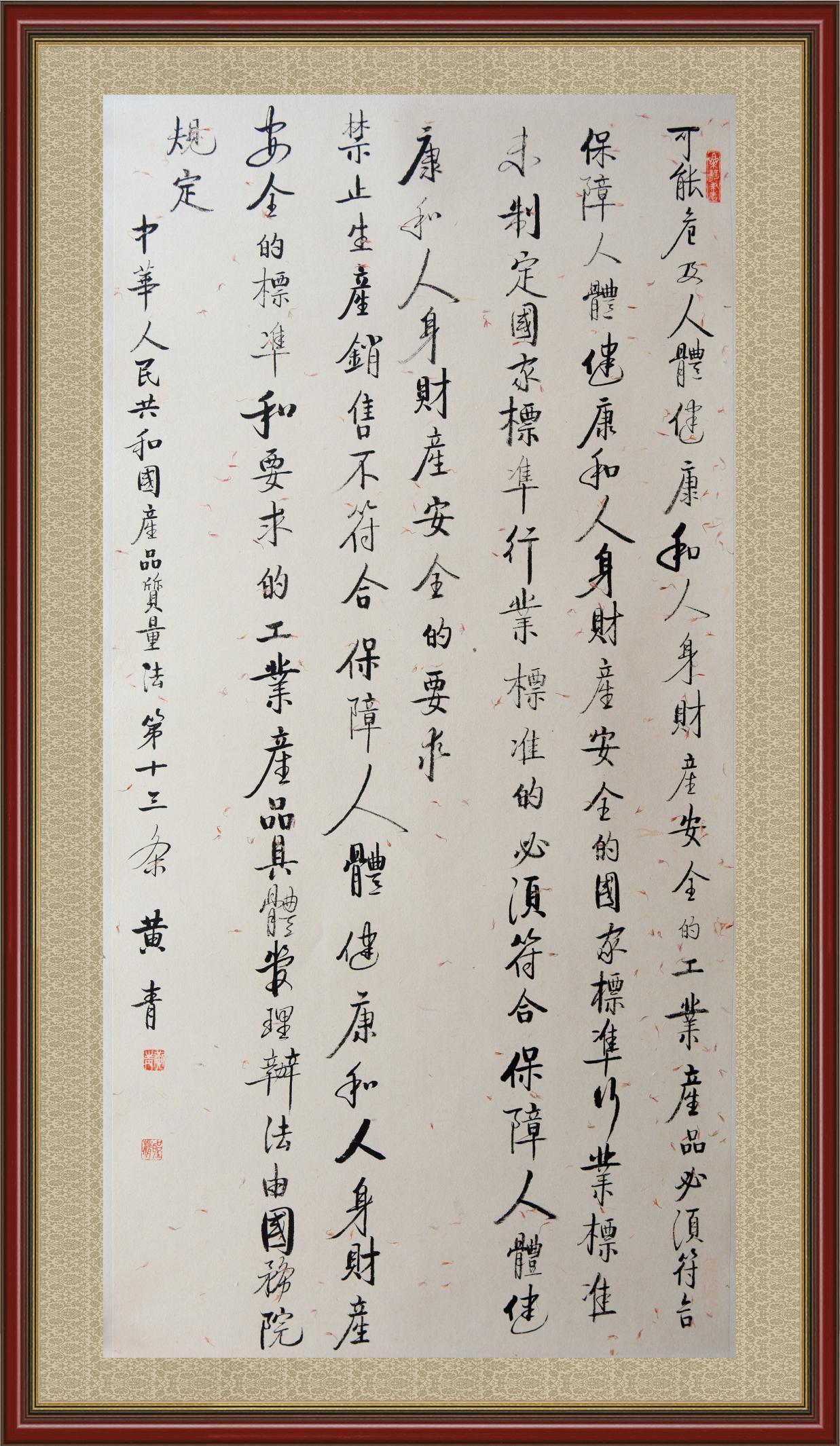 《中華人民共和國產品質量法》自1993年9月1日起開始施行,先后進行三次修正。作為產品質量領域的基本法律,產品質量法對規(guī)范產品質量管理、維護消費者合法權益、促進經濟社會發(fā)展具有重要意義。為更好地學習、宣傳、貫徹這部法律,在國家市場監(jiān)督管理總局法規(guī)司的支持下,法治日報社開展了“‘書·法’系列活動之書寫《中華人民共和國產品質量法》”活動。