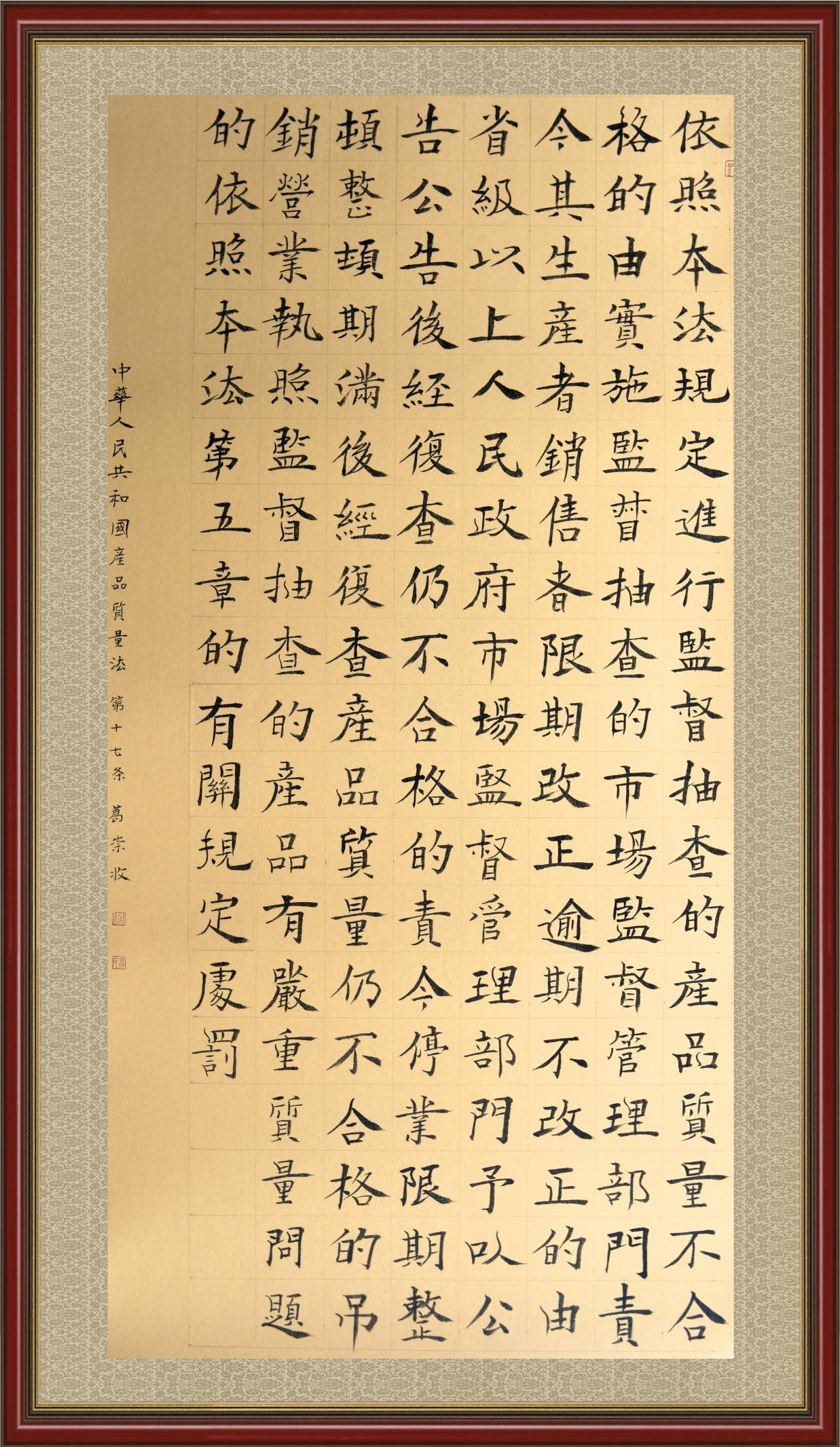 《中華人民共和國產(chǎn)品質(zhì)量法》自1993年9月1日起開始施行,先后進(jìn)行三次修正。作為產(chǎn)品質(zhì)量領(lǐng)域的基本法律,產(chǎn)品質(zhì)量法對規(guī)范產(chǎn)品質(zhì)量管理、維護(hù)消費(fèi)者合法權(quán)益、促進(jìn)經(jīng)濟(jì)社會(huì)發(fā)展具有重要意義。為更好地學(xué)習(xí)、宣傳、貫徹這部法律,在國家市場監(jiān)督管理總局法規(guī)司的支持下,法治日報(bào)社開展了“‘書·法’系列活動(dòng)之書寫《中華人民共和國產(chǎn)品質(zhì)量法》”活動(dòng)。