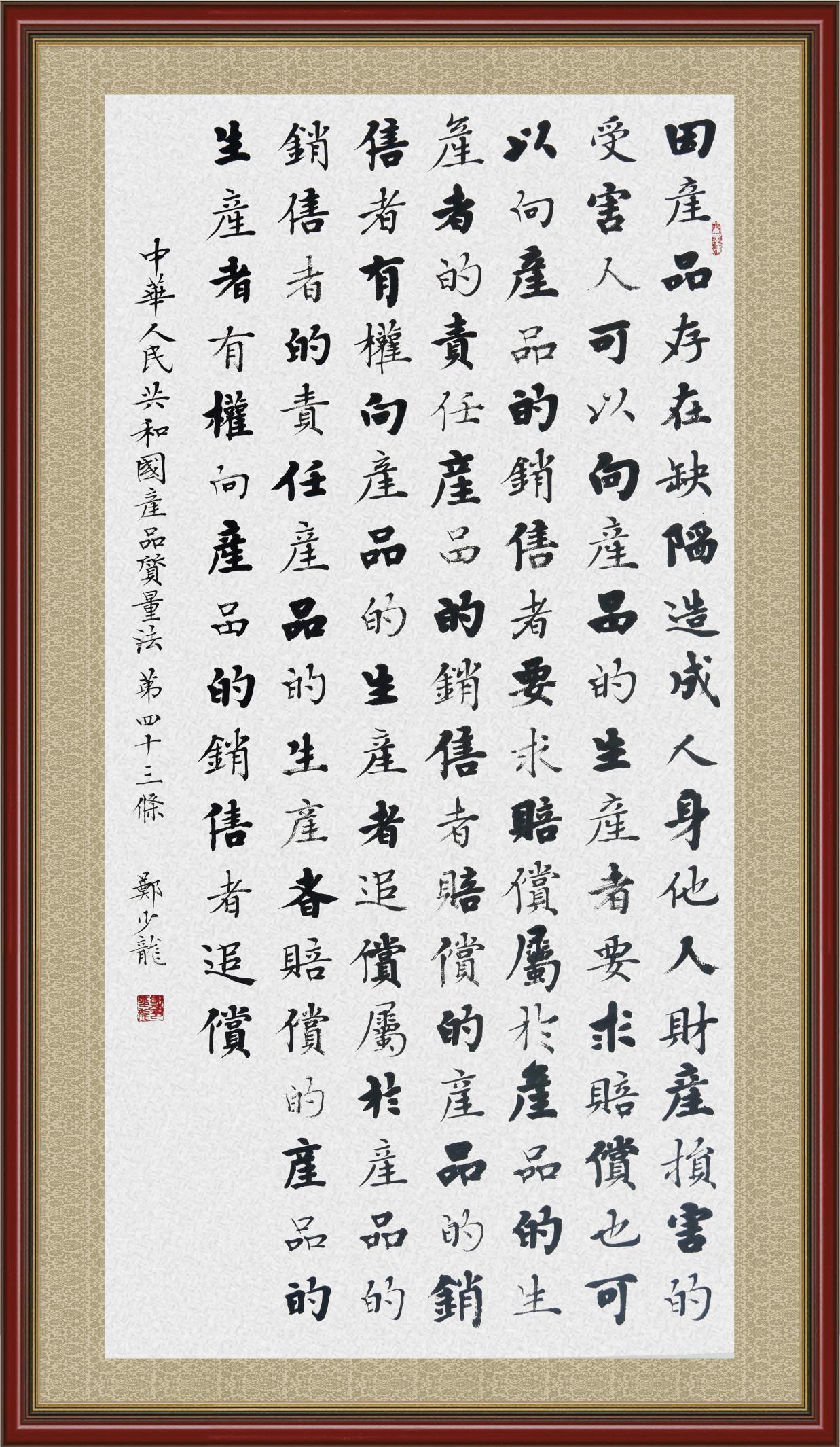 《中華人民共和國(guó)產(chǎn)品質(zhì)量法》自1993年9月1日起開(kāi)始施行,先后進(jìn)行三次修正。作為產(chǎn)品質(zhì)量領(lǐng)域的基本法律,產(chǎn)品質(zhì)量法對(duì)規(guī)范產(chǎn)品質(zhì)量管理、維護(hù)消費(fèi)者合法權(quán)益、促進(jìn)經(jīng)濟(jì)社會(huì)發(fā)展具有重要意義。為更好地學(xué)習(xí)、宣傳、貫徹這部法律,在國(guó)家市場(chǎng)監(jiān)督管理總局法規(guī)司的支持下,法治日?qǐng)?bào)社開(kāi)展了“‘書(shū)·法’系列活動(dòng)之書(shū)寫(xiě)《中華人民共和國(guó)產(chǎn)品質(zhì)量法》”活動(dòng)。