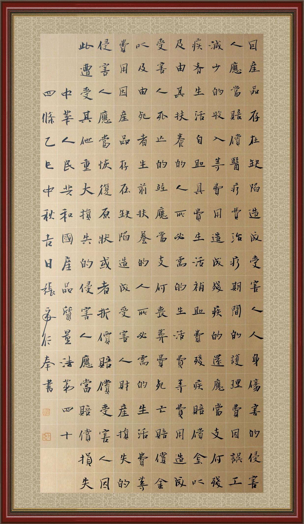 2020年7月11日,由法治日報社主辦的“書·法”系列活動正式啟動,先后書寫《中華人民共和國民法典》《中華人民共和國憲法》《中華人民共和國民營經(jīng)濟(jì)促進(jìn)法》等20部法律法規(guī)。
