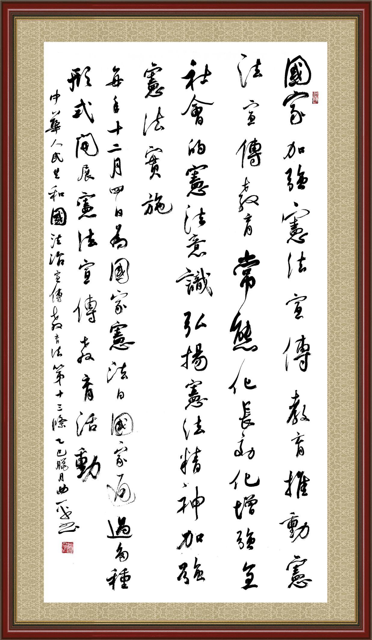 2020年7月11日,由法治日報社主辦的“書·法”系列活動正式啟動,先后書寫《中華人民共和國民法典》《中華人民共和國憲法》《中華人民共和國民營經(jīng)濟促進法》等21部法律法規(guī)。