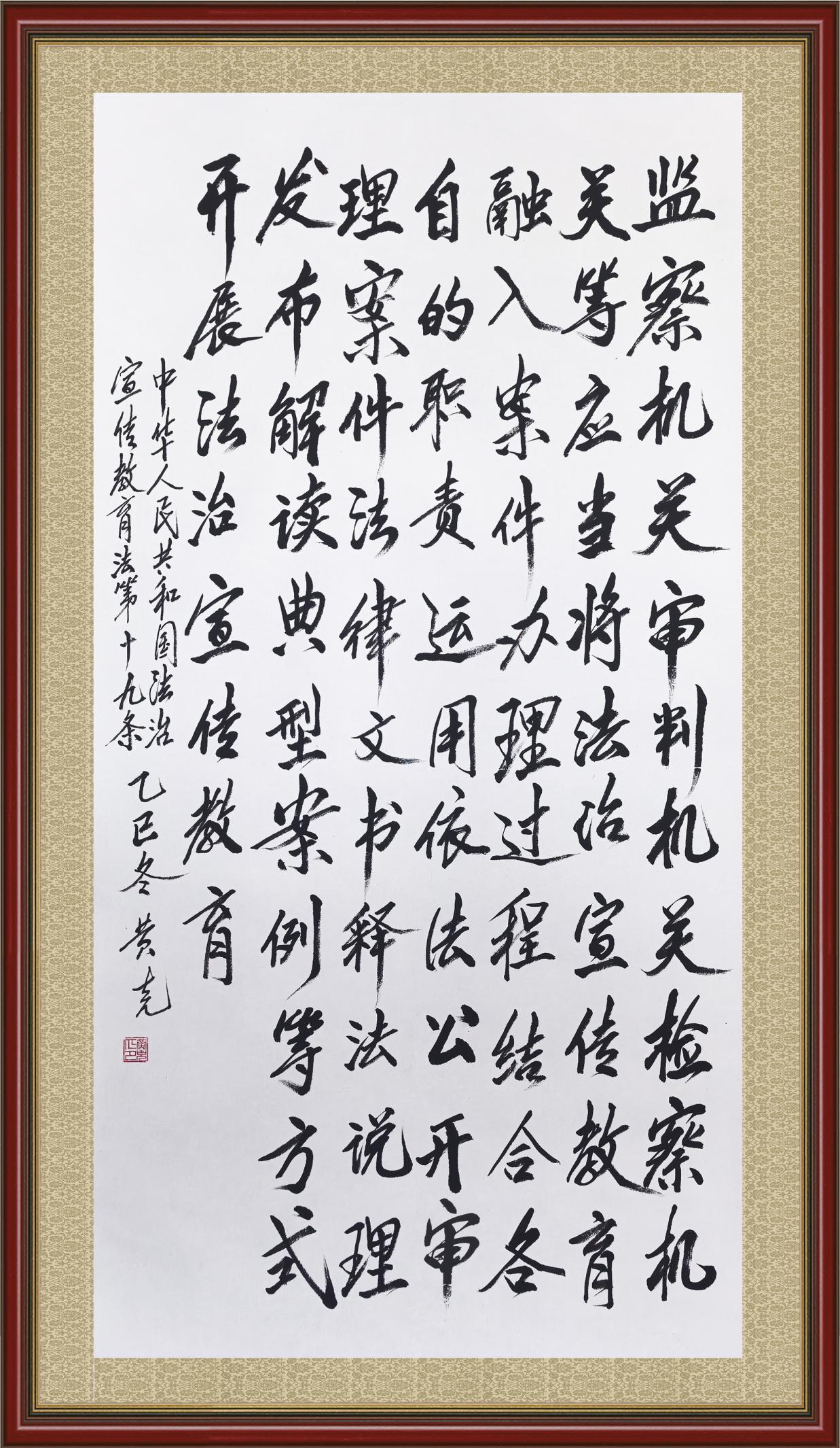 2020年7月11日,由法治日報社主辦的“書·法”系列活動正式啟動,先后書寫《中華人民共和國民法典》《中華人民共和國憲法》《中華人民共和國民營經(jīng)濟促進法》等21部法律法規(guī)。