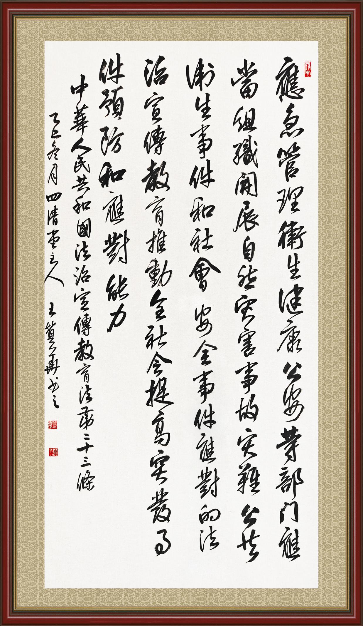 2020年7月11日,由法治日報社主辦的“書·法”系列活動正式啟動,先后書寫《中華人民共和國民法典》《中華人民共和國憲法》《中華人民共和國民營經(jīng)濟(jì)促進(jìn)法》等21部法律法規(guī)。