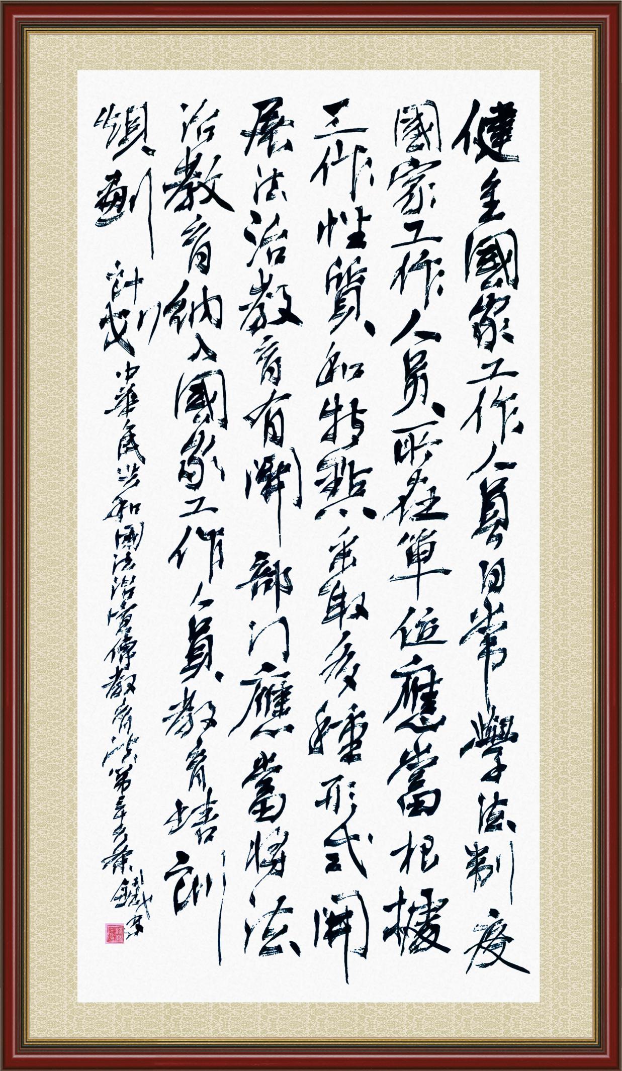 2020年7月11日,由法治日報社主辦的“書·法”系列活動正式啟動,先后書寫《中華人民共和國民法典》《中華人民共和國憲法》《中華人民共和國民營經(jīng)濟促進(jìn)法》等21部法律法規(guī)。