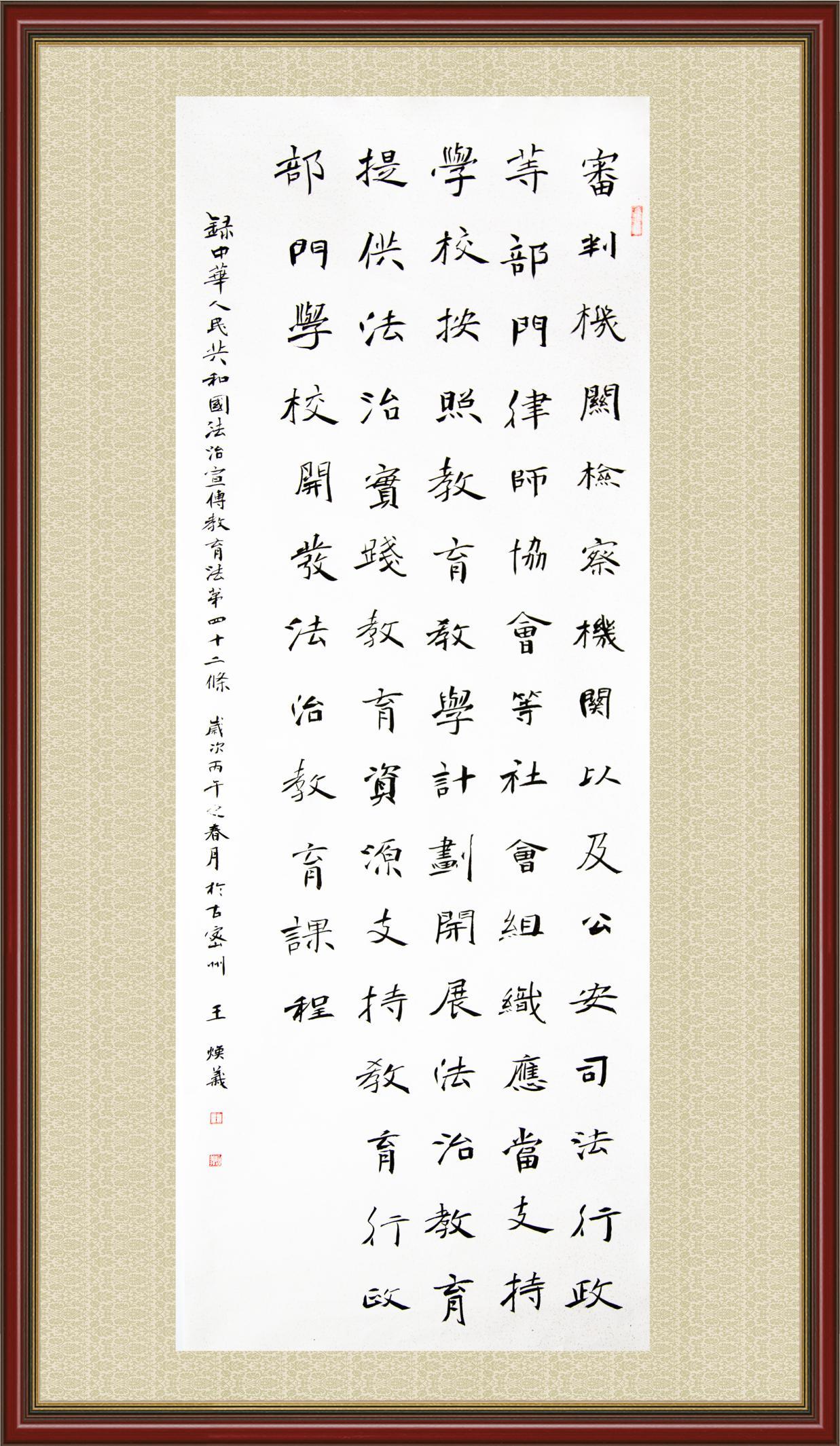 2020年7月11日,由法治日報社主辦的“書·法”系列活動正式啟動,先后書寫《中華人民共和國民法典》《中華人民共和國憲法》《中華人民共和國民營經(jīng)濟(jì)促進(jìn)法》等21部法律法規(guī)。