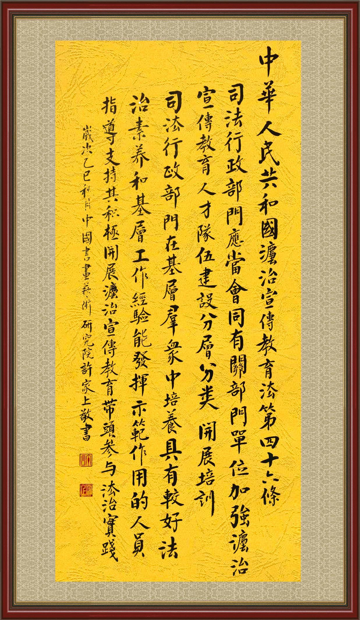 2020年7月11日,由法治日報社主辦的“書·法”系列活動正式啟動,先后書寫《中華人民共和國民法典》《中華人民共和國憲法》《中華人民共和國民營經(jīng)濟促進法》等21部法律法規(guī)。