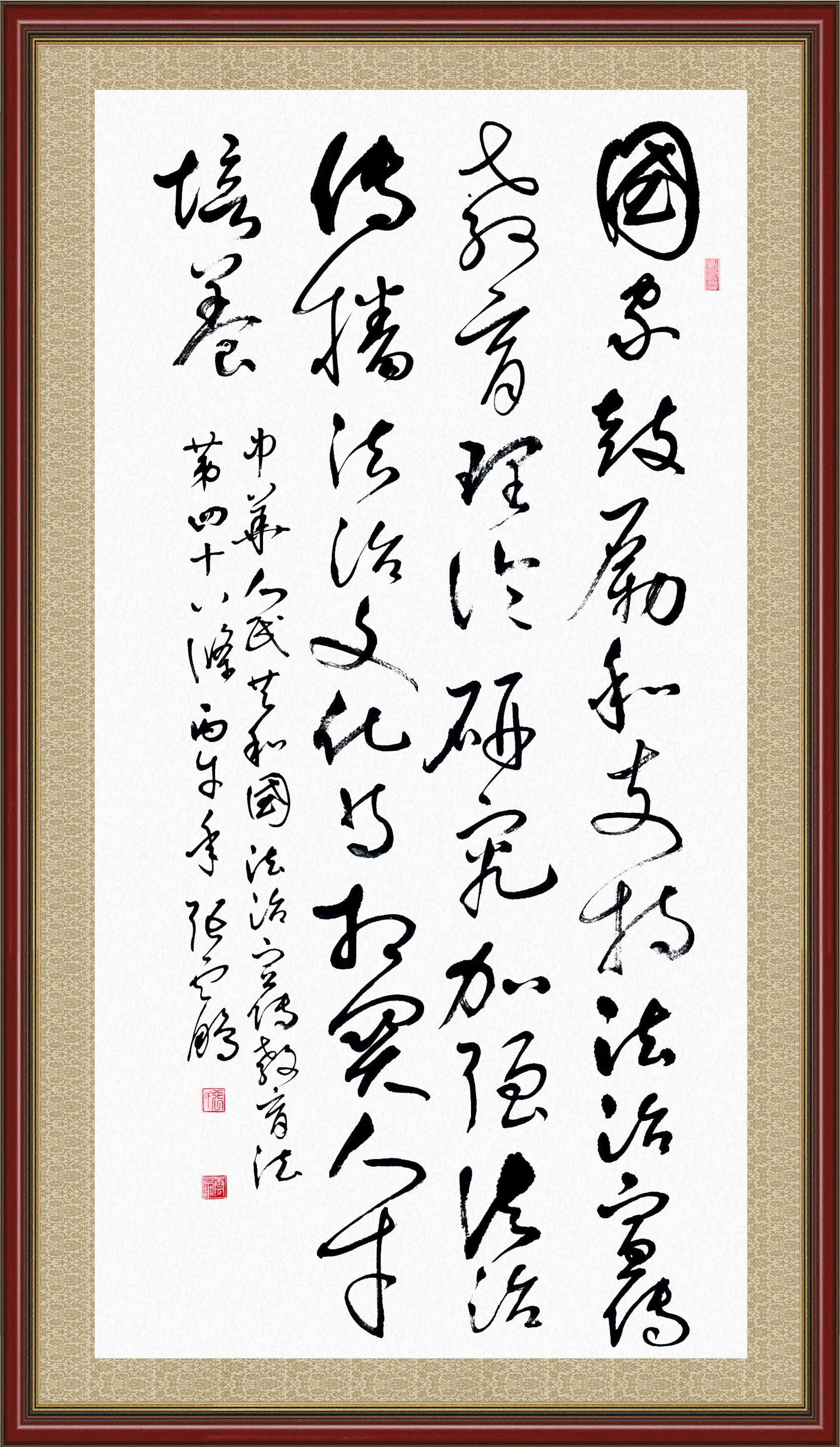 2020年7月11日,由法治日報(bào)社主辦的“書·法”系列活動正式啟動,先后書寫《中華人民共和國民法典》《中華人民共和國憲法》《中華人民共和國民營經(jīng)濟(jì)促進(jìn)法》等21部法律法規(guī)。