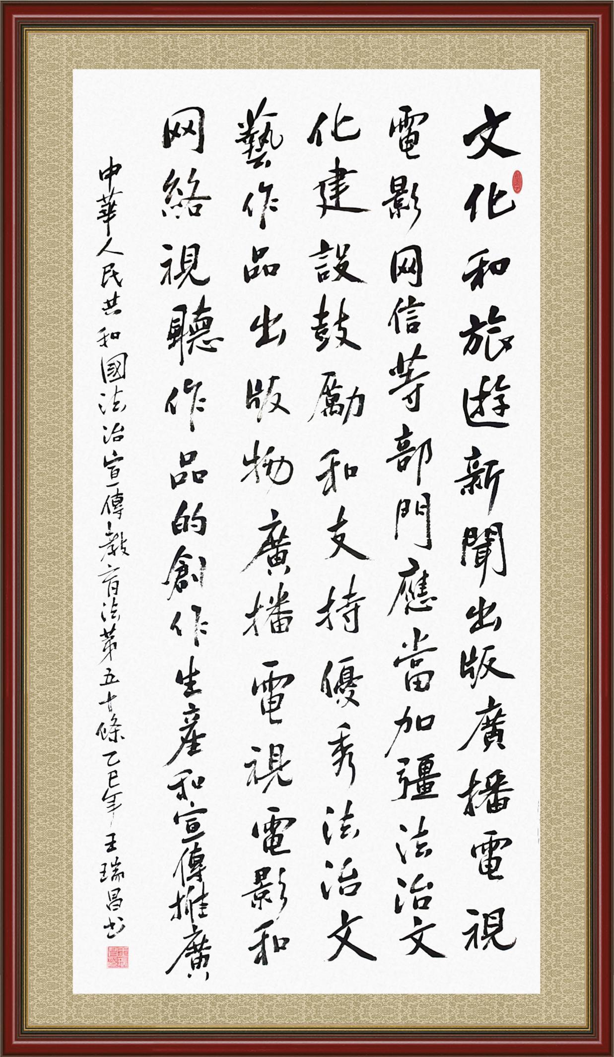 2020年7月11日,由法治日報社主辦的“書·法”系列活動正式啟動,先后書寫《中華人民共和國民法典》《中華人民共和國憲法》《中華人民共和國民營經(jīng)濟促進法》等21部法律法規(guī)。