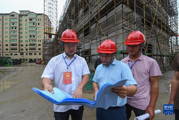 在浙江省湖州市吳興區(qū)東林鎮(zhèn)星火村,當?shù)厝舜蟠砑按迕翊韺π腔鸫遛r(nóng)民新村建設(shè)項目的施工進展情況進行監(jiān)督檢查(2021年6月2日攝)。新華社記者 徐昱 攝