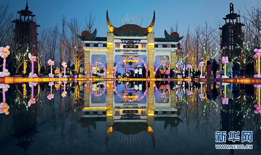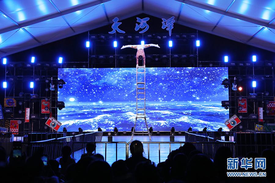 1月31日晚,天河潭景區(qū)廣場(chǎng)上舉行走秀、歌舞、雜技等舞臺(tái)演藝。新華網(wǎng) 盧志佳 攝