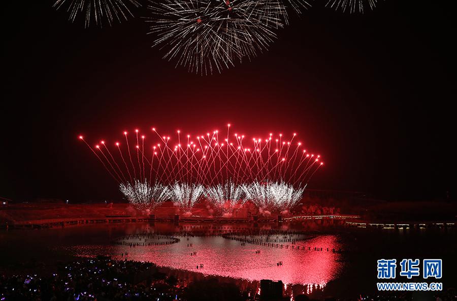 1月31日晚,煙花光影水秀在天河潭景區(qū)上演。新華網(wǎng) 盧志佳 攝