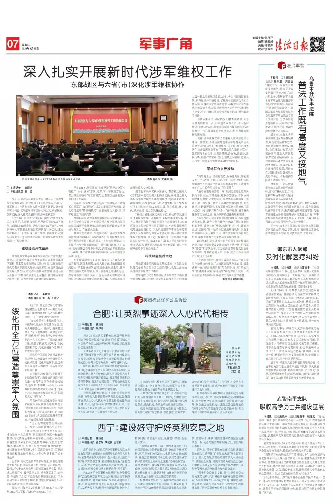 兩年來(lái),西寧軍事檢察院還多次協(xié)調(diào)組織駐地部隊(duì)官兵開(kāi)展“護(hù)英烈鑄忠誠(chéng)”等主題黨日活動(dòng),官兵定期輪流幫助陵園管護(hù)人員清除雜草、修繕紀(jì)念設(shè)施。該院辦理的兩起行政公益訴訟案件入選為全國(guó)紅色資源保護(hù)典型案例,3縣烈士陵園也成為當(dāng)?shù)刂攸c(diǎn)紅色教育基地。