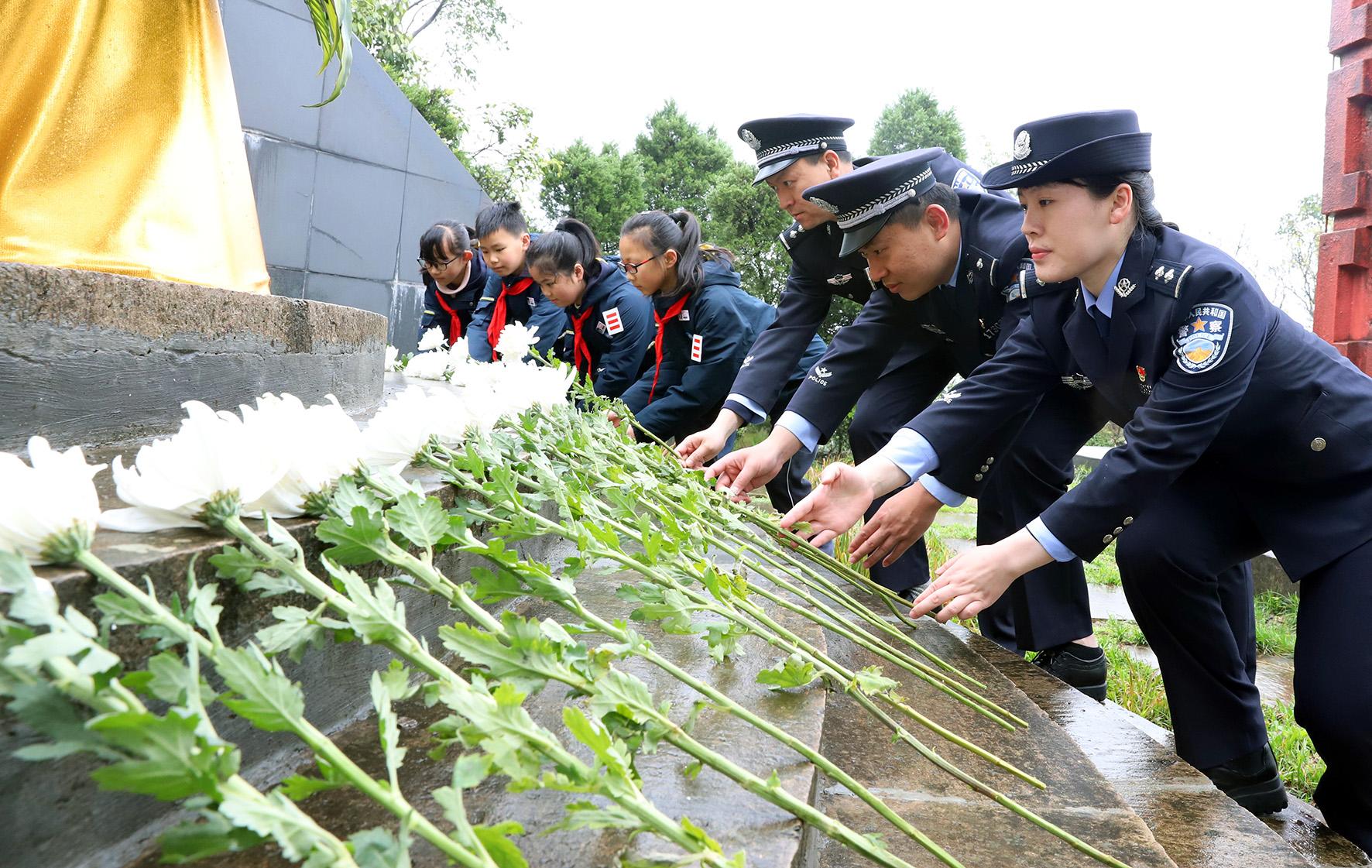 3月30日,浙江省臺(tái)州市公安局路橋分局橫街派出所民警和少年兒童一起為抗日戰(zhàn)爭(zhēng)犧牲的陳安寶烈士敬獻(xiàn)鮮花,以表深切緬懷之情。