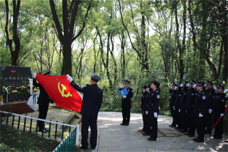 上午10時許,祭掃儀式開始。全體民輔警整裝列隊,肅立烈士墓碑前,在莊嚴(yán)肅穆的氛圍中,王永生、杜杰同志緩步上前,向烈士墓碑及長眠在此的革命先烈敬獻花籃并為花籃梳理挽聯(lián)。隨后,全體人員脫帽肅立默哀,并向革命烈士敬獻鮮花。最后,面對莊嚴(yán)的黨旗,全體人員舉起右手重溫了入黨誓詞,表達了對黨的赤誠之心。
