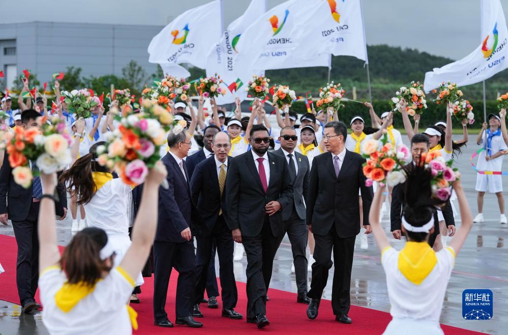 7月27日下午,來華出席成都大運會開幕式并訪問的圭亞那總統(tǒng)阿里抵達(dá)四川省成都市。