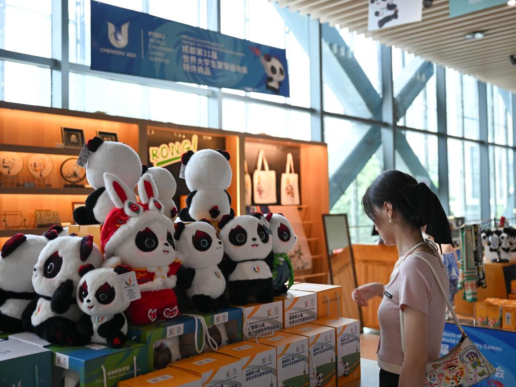 ↑7月18日,市民在成都大運(yùn)會(huì)成都博物館官方特許商品零售店內(nèi)選購(gòu)“蓉寶”公仔。