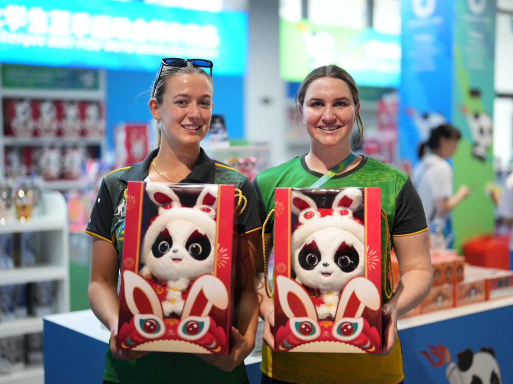 ↑澳大利亞水球隊(duì)的露辛達(dá)·蘇珊(左)和隊(duì)友展示剛剛買到的兔年版“蓉寶”。
