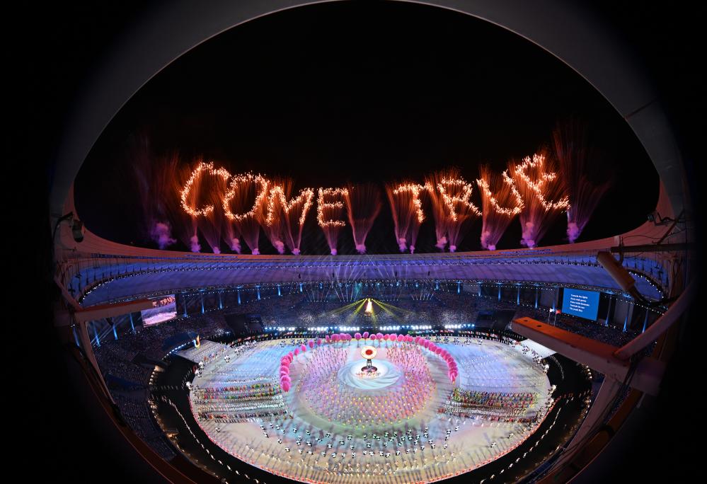 成都成就夢(mèng)想。隨著大運(yùn)會(huì)火炬塔被點(diǎn)燃,焰火在空中打出成都大運(yùn)會(huì)的U形會(huì)徽,體育場(chǎng)上空焰火呈現(xiàn)英文字樣“Make Dreams Come True”。