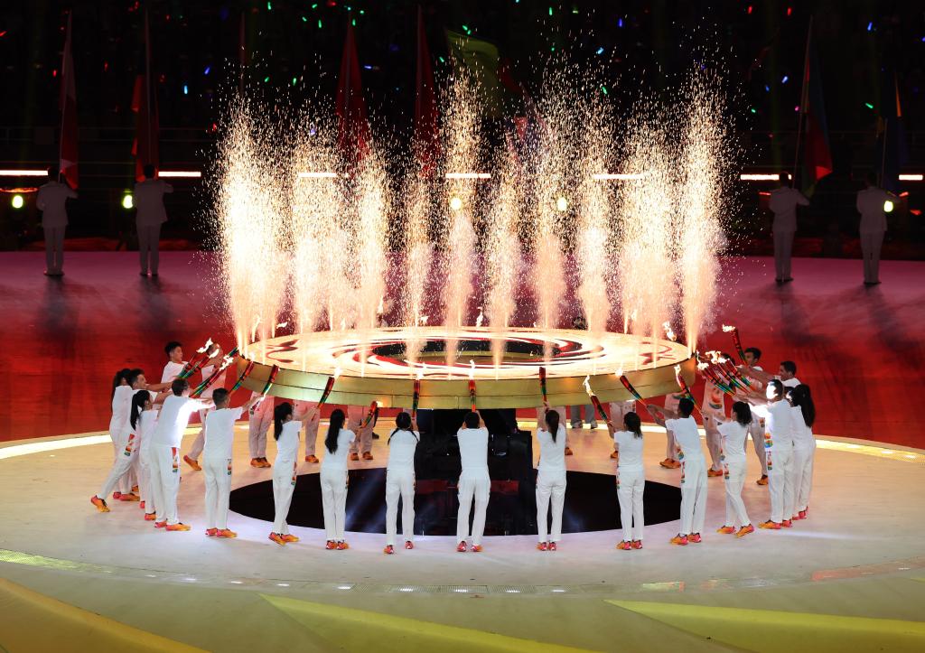 新華社成都7月28日電(記者趙建通、袁秋岳、曹奕博、周勉)跨越三千年而來(lái)的“太陽(yáng)神鳥(niǎo)”圣火盤(pán)被點(diǎn)燃,焰火盤(pán)旋向上,體育場(chǎng)上空煙花絢麗四射,將場(chǎng)外的主火炬塔引燃,圣火熊熊燃燒,在夜空中綻放出璀璨奪目的光芒。