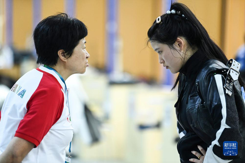 8月1日,中國隊選手邢航(右)與教練交流。新華社記者 曹祎銘 攝