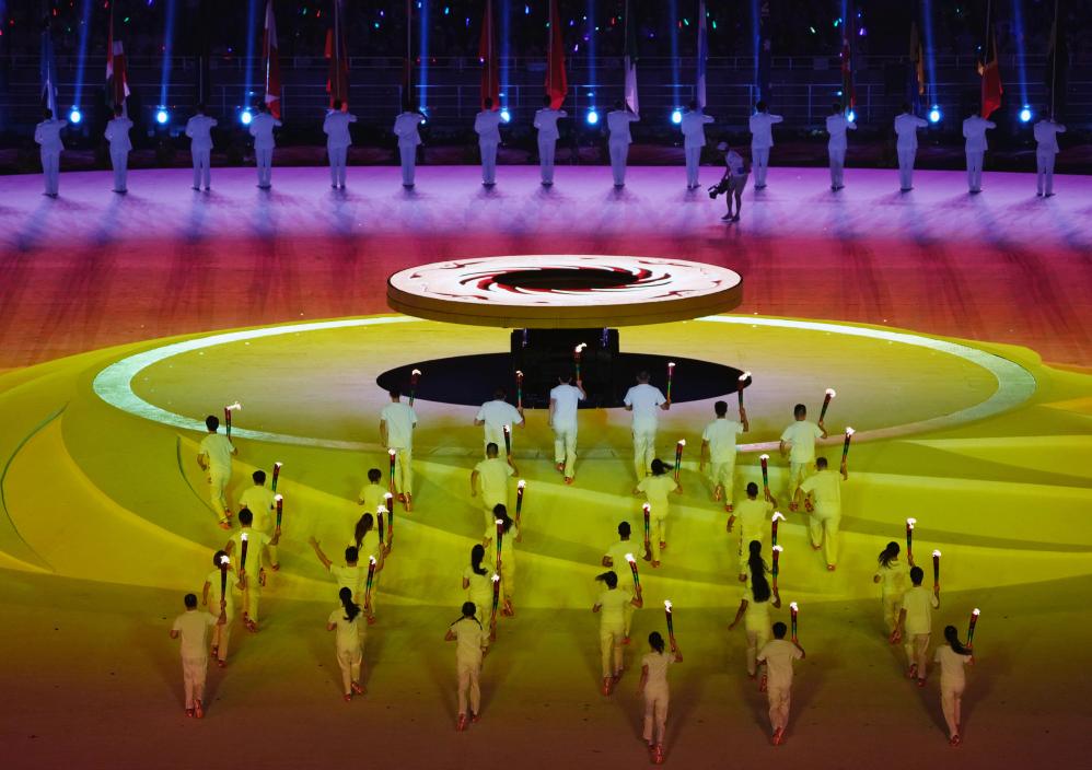 7月28日,火炬手在成都大運(yùn)會(huì)開(kāi)幕式上入場(chǎng)。新華社記者 李欣 攝