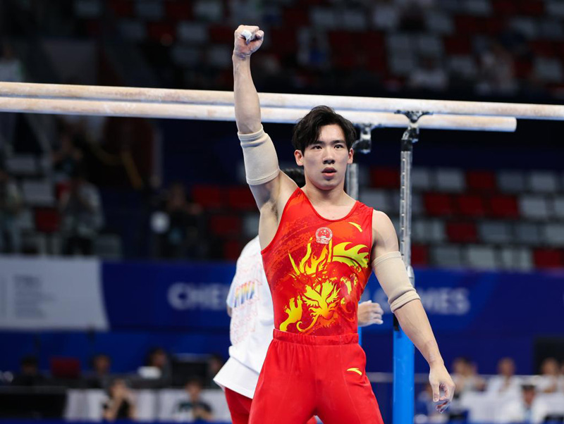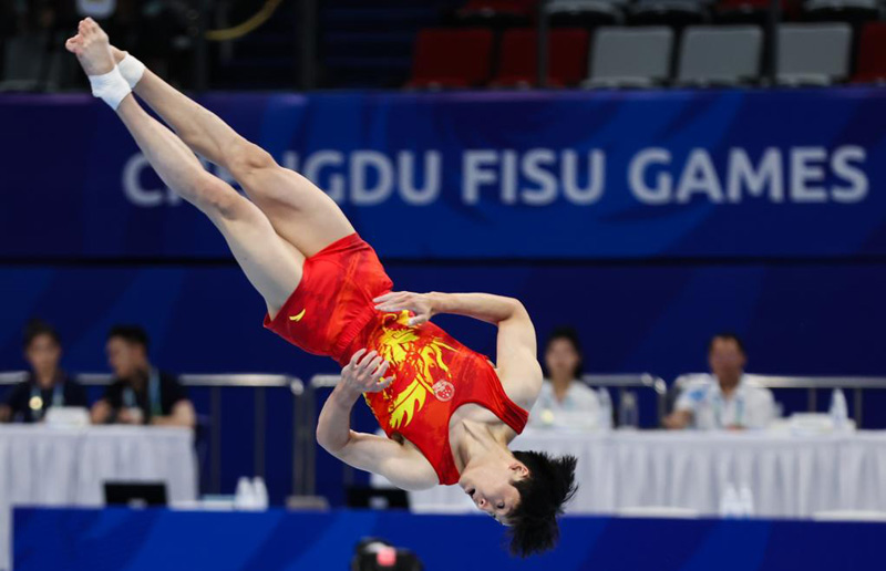 新華社成都8月2日電(記者譚暢、朱青)成都大運(yùn)會體操項(xiàng)目2日進(jìn)入第二個比賽日,由張博恒、鄒敬園、蘇煒德、蘭星宇、侍聰組成的中國隊(duì)以262.594分獲得男子團(tuán)體冠軍。