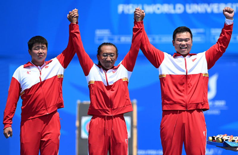 7月30日,中國隊選手陳巖松、杜美余、王世坤(從左至右)在頒獎儀式上。當日,在成都舉行的第31屆世界大學(xué)生夏季運動會男子復(fù)合弓團體金牌賽中,中國隊以231環(huán):224環(huán)戰(zhàn)勝法國隊,獲得冠軍。新華社記者 張龍 攝