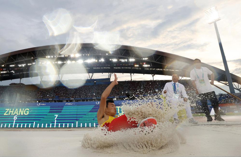 8月6日,張景強(qiáng)(左)在比賽中。當(dāng)日,在成都大運(yùn)會(huì)男子跳遠(yuǎn)決賽中,他以7米93的成績獲得金牌。新華社記者 賈浩成 攝