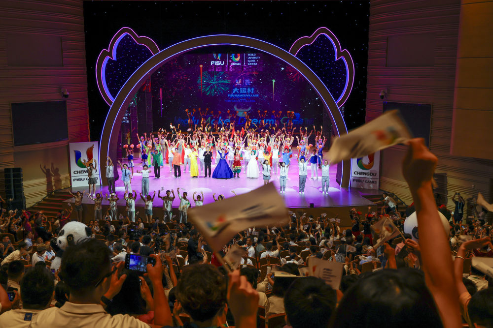 成都大運村以“建改結(jié)合”方式全面融入成都大學,該校校園在大運會期間成為來自世界各地學生運動員的家。作為此次系列主題晚會的最后一場,《成就夢想》也是唯一一個全部由成都大學師生演出的主題晚會。