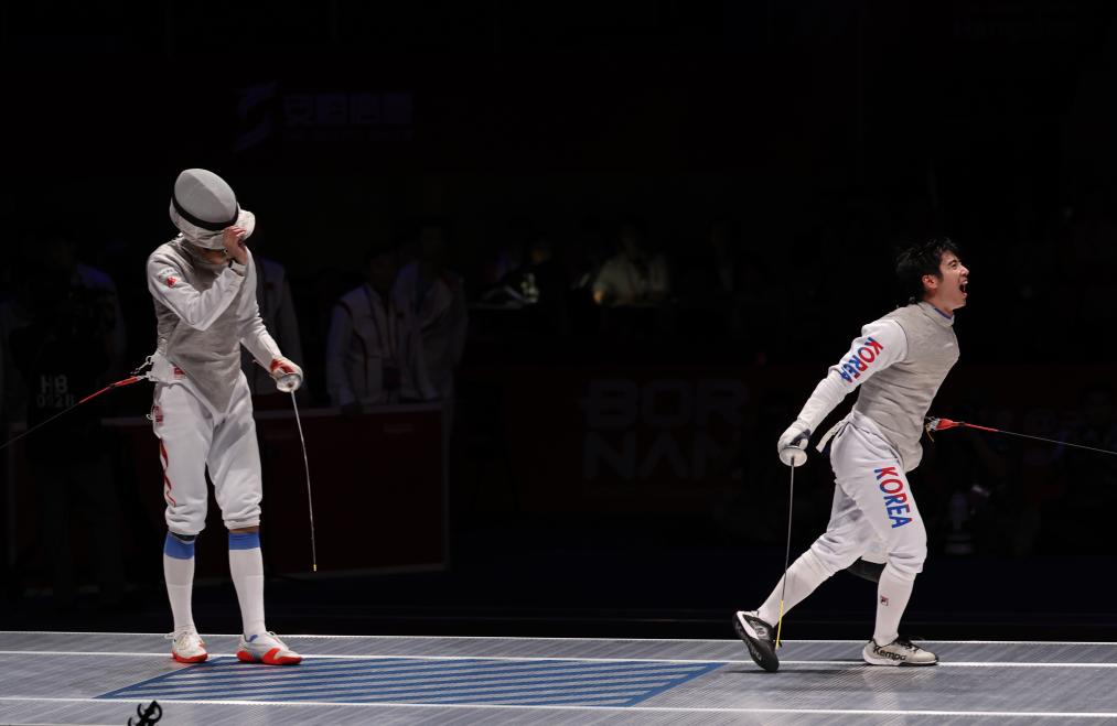 中國男子花劍隊當(dāng)日有驚喜有遺憾。團(tuán)體半決賽面對世界排名第一、今年世錦賽和亞錦賽上均摘得金牌的日本隊,中國隊以45:44逆轉(zhuǎn)險勝對手,但在決賽中以38:45不敵衛(wèi)冕冠軍韓國隊。中國隊陳海威賽后說:“決賽我們都付出了所有,但還是比較遺憾?!?/p>