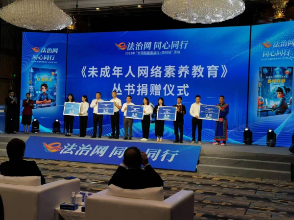 青少年是祖國的未來,也是網(wǎng)上學(xué)習(xí)、交流、生活最活躍的參與者、實踐者。為營造風清氣正的網(wǎng)絡(luò)空間,守護青少年健康上網(wǎng),10月11日上午,在2023年“全國網(wǎng)絡(luò)普法行·四川站”啟動儀式上,多家愛心企業(yè)向四川省中小學(xué)捐贈《未成年人網(wǎng)絡(luò)素養(yǎng)教育》叢書。