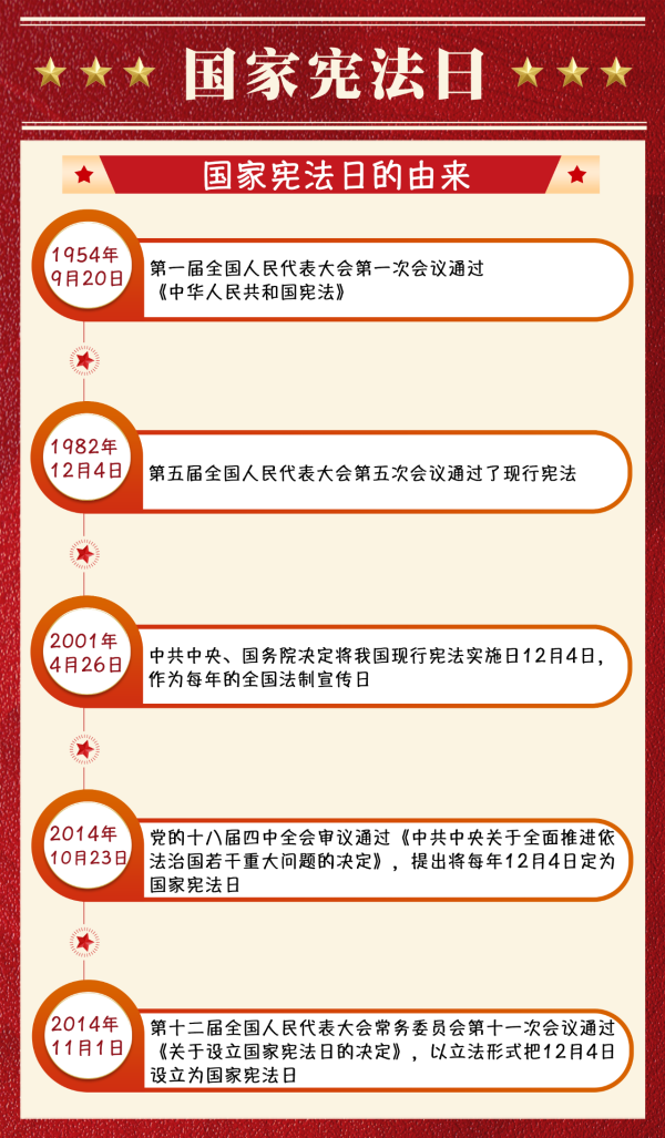 2014年11月1日,第十二屆全國人民代表大會常務(wù)委員會第十一次會議通過《關(guān)于設(shè)立國家憲法日的決定》,以立法形式把12月4日設(shè)立為國家憲法日。