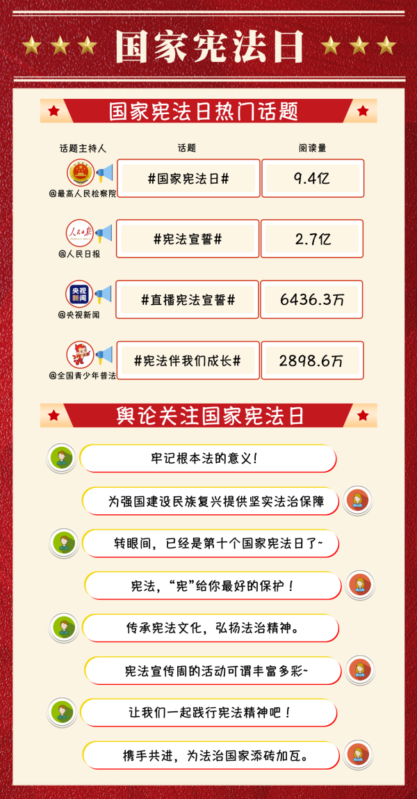 在第十個國家憲法日到來之際,多方積極宣傳相關(guān)信息,形成了多渠道、深層次的傳播格局,為弘揚憲法精神創(chuàng)造良好輿論氛圍。“#國家憲法日#”“#憲法宣誓#”等微博熱門話題閱讀量分別達(dá)到9.4億余次、2.7億余次?!稗D(zhuǎn)眼間,已經(jīng)是第十個國家憲法日了”“傳承憲法文化,弘揚法治精神”“攜手共進(jìn),為法治國家添磚加瓦”等網(wǎng)民留言高居評論區(qū)前排。